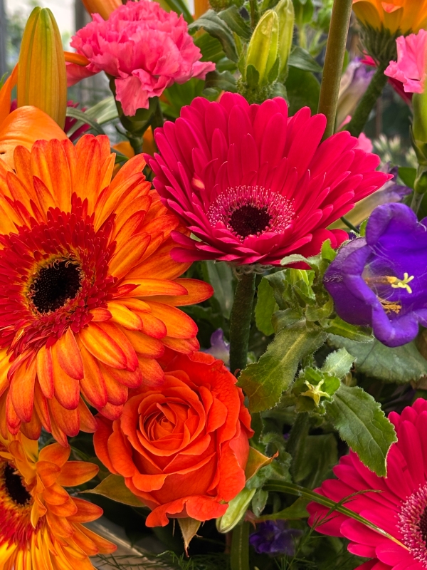 This vibrant arrangement consists of seasonal rich purple, cerise pink and vibrant orange. A big splash of colour to brighten a loved one's day.